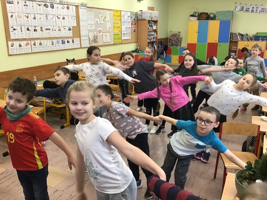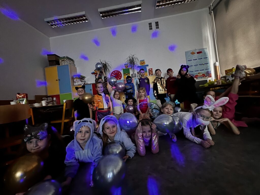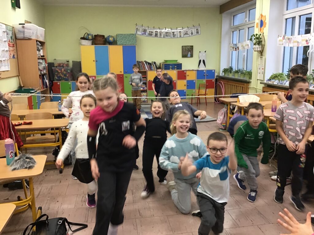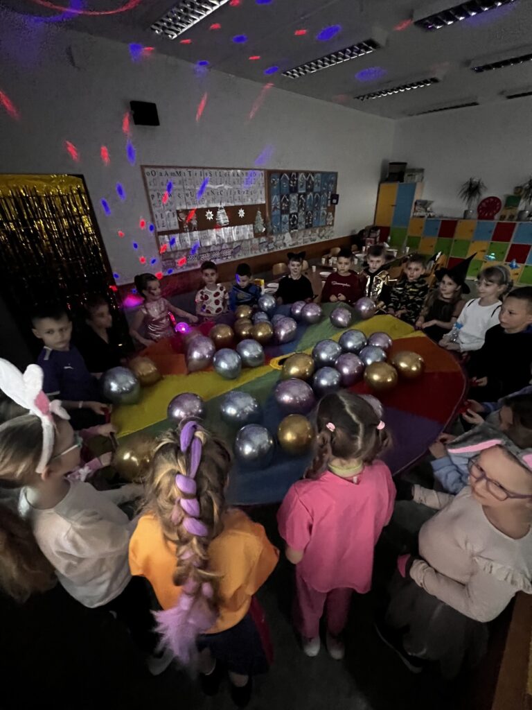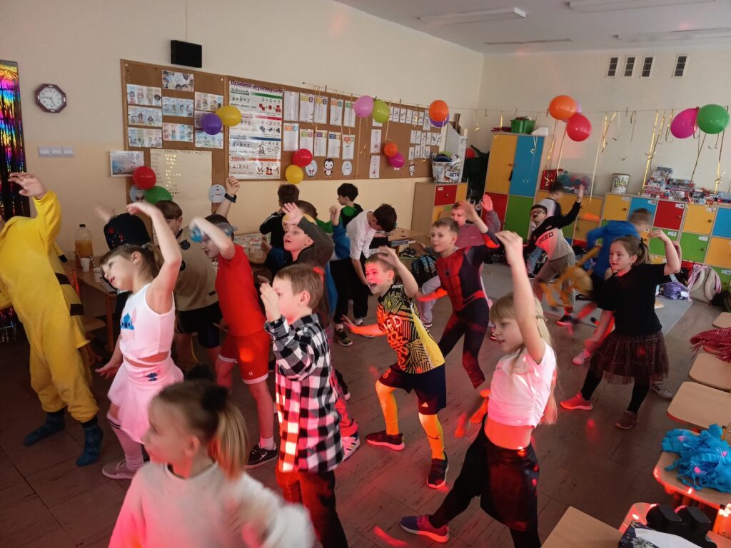 W każdej klasie rozbrzmiewała muzyka, przy której dzieci tańczyły i uczestniczyły w różnorodnych konkurencjach. Nie zabrakło klasycznych zabaw takich jak taniec z balonem, taniec na gazetach, taneczny wąż czy popularne „gorące krzesełka”.