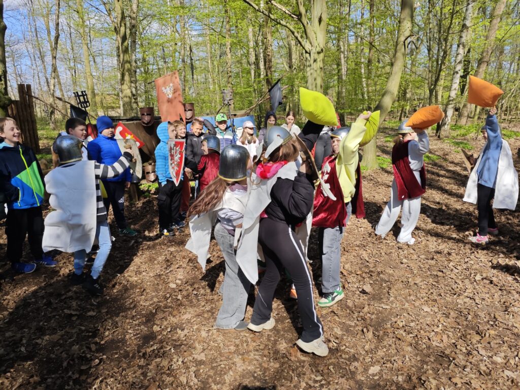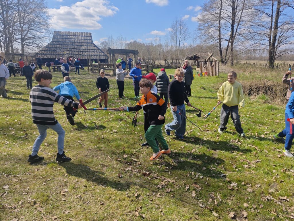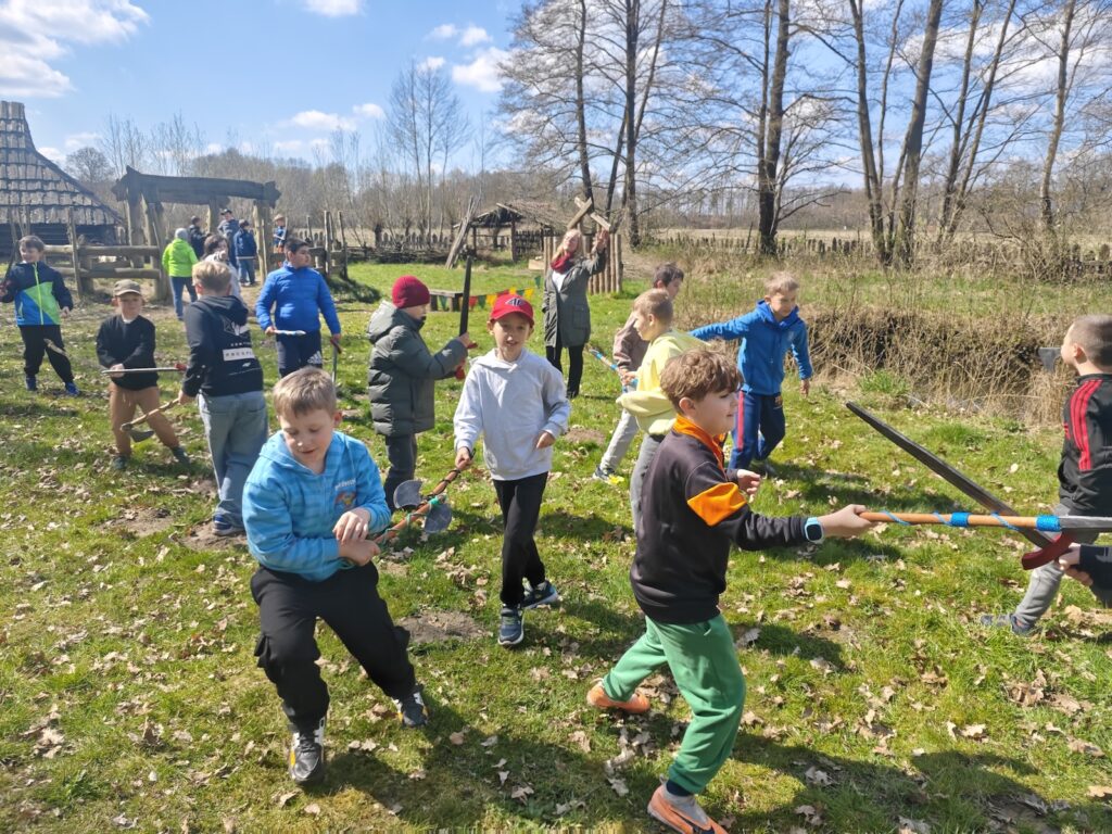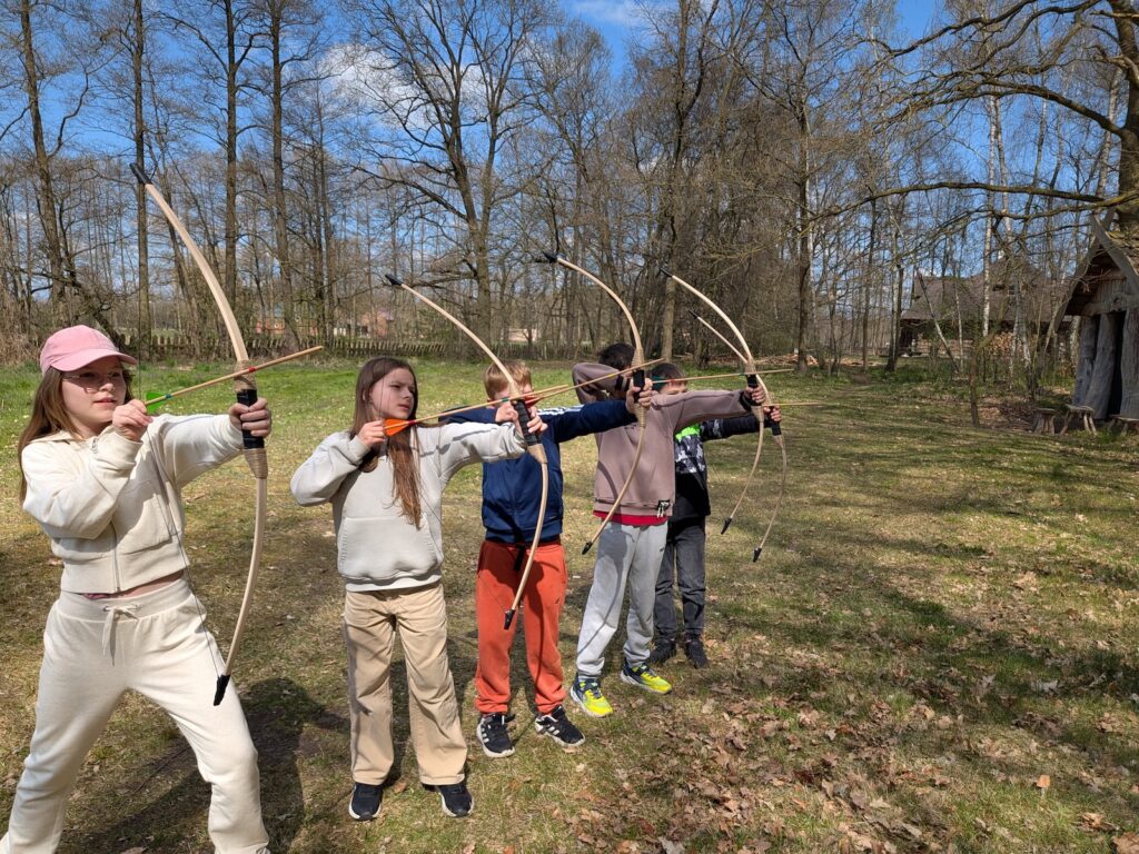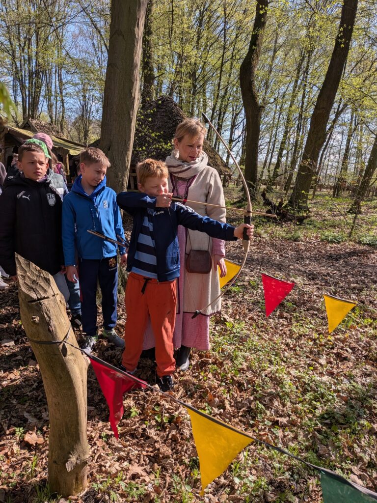 Ogromnym zainteresowaniem cieszyły się także warsztaty archeologiczne. Uczniowie wcielili się w rolę odkrywców, poszukując i rozpoznając artefakty związane z dawnymi czasami. Nie zabrakło również ruchu i dobrej zabawy – odbyła się „bitwa”, w której zamiast broni wykorzystano poduszki, a uczestnicy mieli na sobie elementy żołnierskiego wyposażenia. Dużo emocji dostarczyły także konkurencje takie jak strzelanie z łuku czy rzuty do celu.