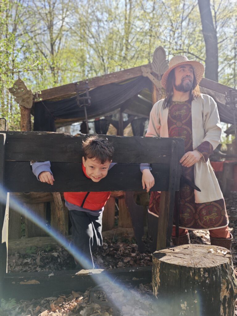 Jedną z bardziej zaskakujących atrakcji była możliwość… zakucia w dyby, co wywołało wiele śmiechu i stało się świetną okazją do pamiątkowych zdjęć.