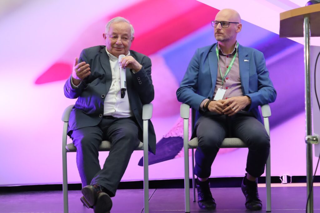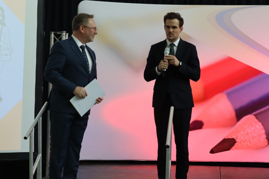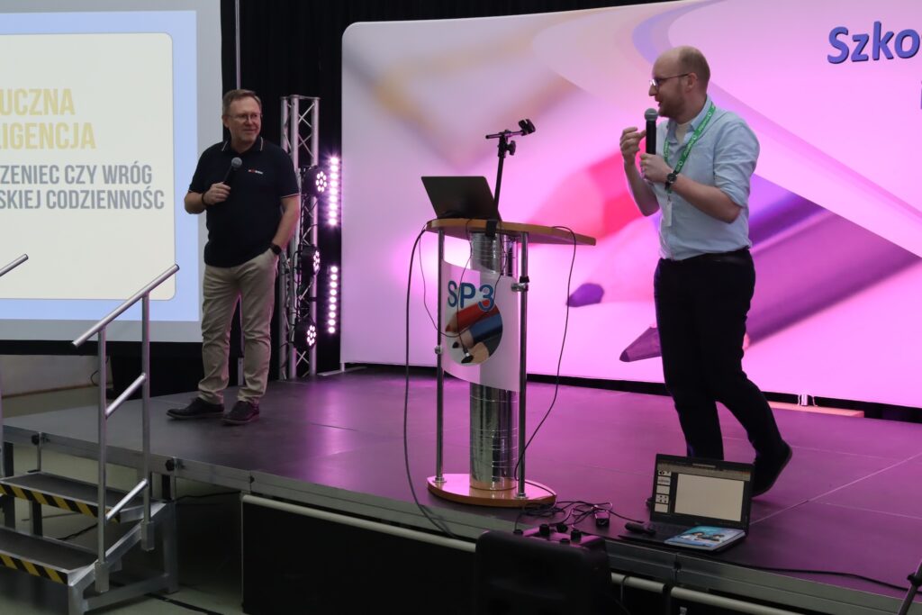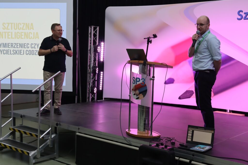 Ostatnią część konferencji stanowił dialog na temat sztucznej inteligencji w szkole.Wojciech Wątor prezentował podejście entuzjastyczne wobec sztucznej inteligencji, podkreślając jej potencjał w usprawnianiu pracy nauczyciela, personalizacji nauczania oraz zwiększaniu zaangażowania uczniów. Zwracał uwagę, że AI może stać się realnym wsparciem w codziennych obowiązkach dydaktycznych, a jej obecność w szkole jest nieunikniona. Z kolei Dariusz Stachecki przyjął stanowisko bardziej sceptyczne, akcentując zagrożenia związane z nadmiernym zaufaniem do technologii. Podkreślał ryzyko powierzchownego uczenia się, utraty samodzielności przez uczniów oraz brak pełnej kontroli nad generowanymi treściami. W jego wypowiedziach wybrzmiewała troska o zachowanie równowagi między nowoczesnością a odpowiedzialnością edukacyjną.