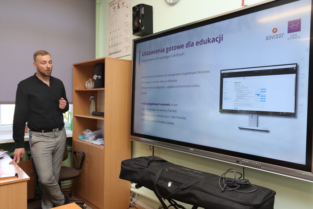 Tematyka organizacyjno-techniczna została rozwinięta przez Annę Robakowską, która omówiła zarządzanie sprzętem zakupionym w ramach KPO przy użyciu Microsoft Intune. Podkreśliła, że „więcej sprzętu oznacza większą odpowiedzialność za jego bezpieczeństwo i właściwą konfigurację”.