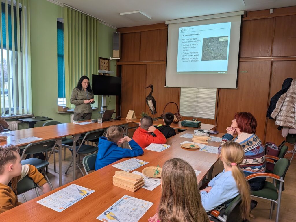 Głównym tematem naszych warsztatów było hasło: „Zimowa spiżarnia i bezpieczny dom”. Pani Agnieszka zabrała nas w fascynującą podróż po świecie skrzydlatych mieszkańców lasu. Uczyliśmy się rozpoznawać różne gatunki ptaków i dowiedzieliśmy się, dlaczego niektóre z nich wyruszają w daleką podróż do ciepłych krajów, a inne zostają z nami na zimę. Prawdziwą gratką była możliwość „podglądania” natury z bliska! Dzięki nagraniom z kamerki umieszczonej przy gnieździe, mogliśmy zobaczyć bociany czarne. Choć film pochodził z cieplejszych miesięcy (bo przecież teraz bociany odpoczywają w Afryce), to widok tych rzadkich ptaków w ich naturalnym domu zrobił na wszystkich ogromne wrażenie.