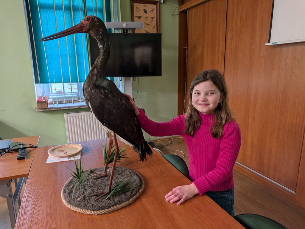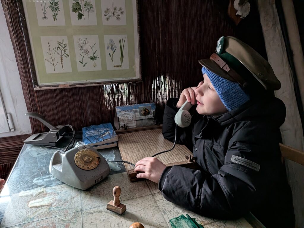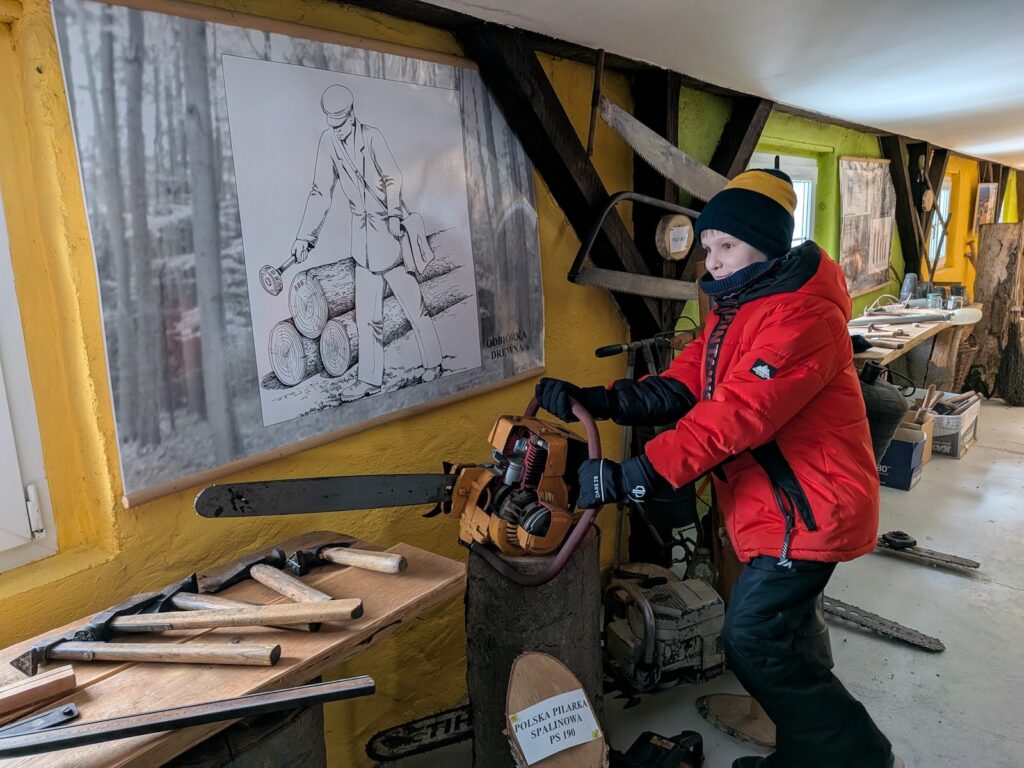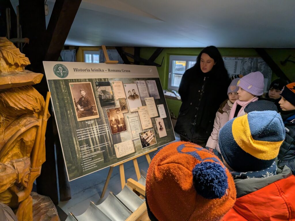 Ale! Teoria to nie wszystko! Wybraliśmy się na spacer do pobliskiego parku, aby w praktyce zobaczyć, jak ptaki korzystają z karmników. Następnie odwiedziliśmy Izbę Edukacji Leśnej, w której poczuliśmy się jak w wehikule czasu! Oglądaliśmy dawne narzędzia i maszyny, takie jak pługi konne czy stare numeratory oraz historyczne mapy i czarno-białe zdjęcia, które pokazały nam, jak dawniej wyglądała praca leśnika.