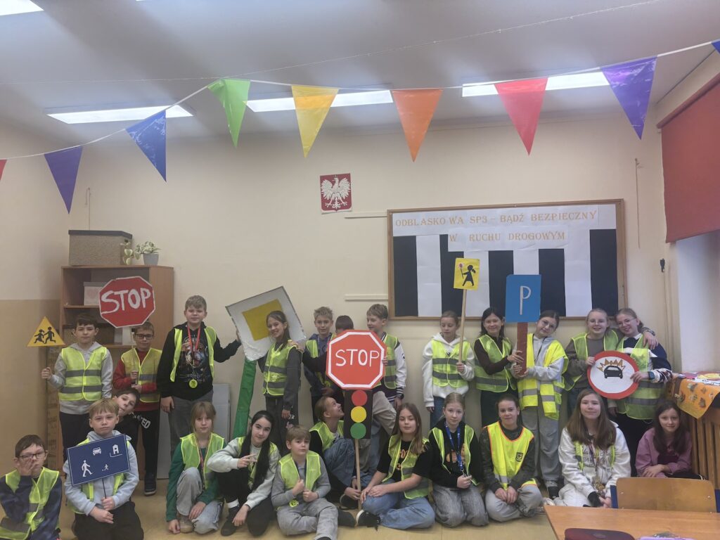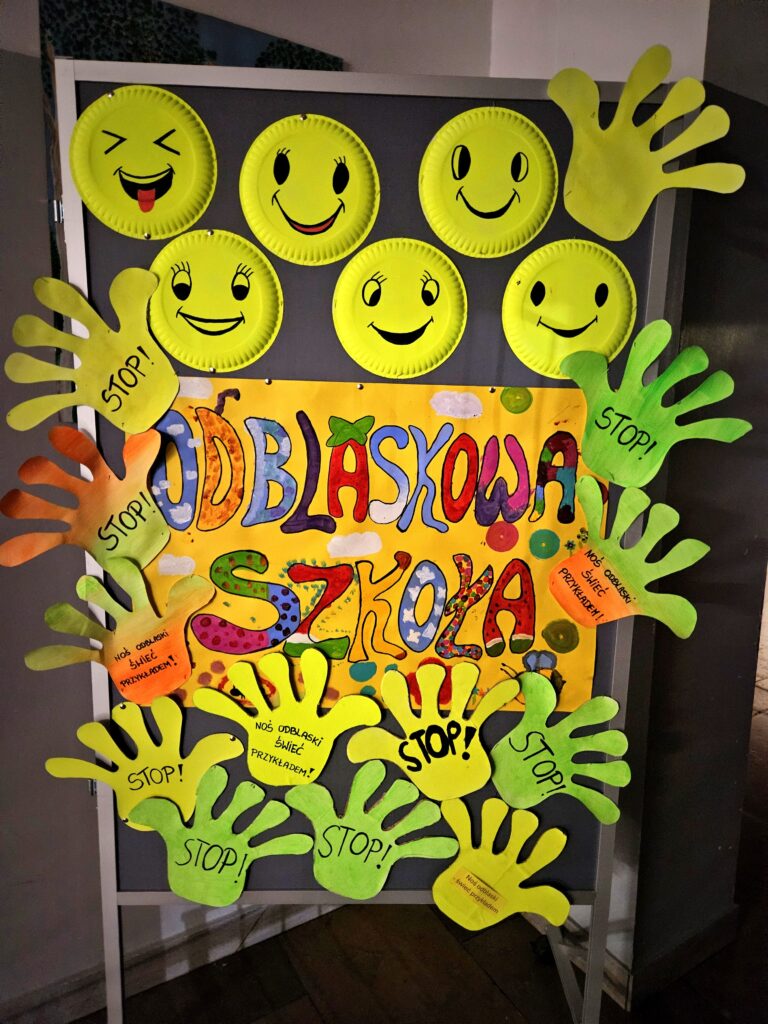 W naszej szkole bezpieczeństwo to nie tylko temat lekcji, ale również inspiracja do twórczego działania! Klasy IV oraz chętni uczniowie z innych klas zaangażowali się w wyjątkowe przedsięwzięcie – dekorowanie szkoły ogromnymi, kolorowymi znakami drogowymi oraz elementami odblaskowymi. Pomysł miał na celu promowanie zasad bezpieczeństwa w ruchu drogowym oraz przypomnienie wszystkim – dzieciom, nauczycielom i rodzicom – jak ważne jest przestrzeganie przepisów i zachowanie ostrożności na drodze.