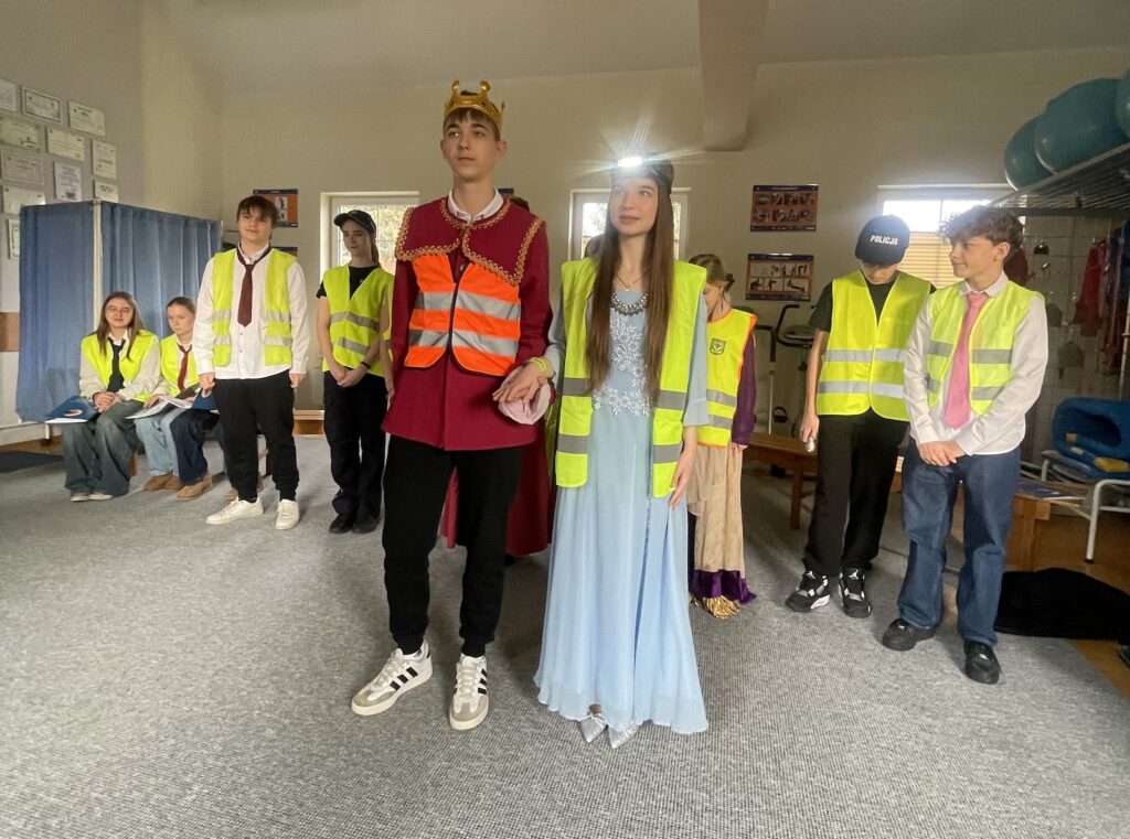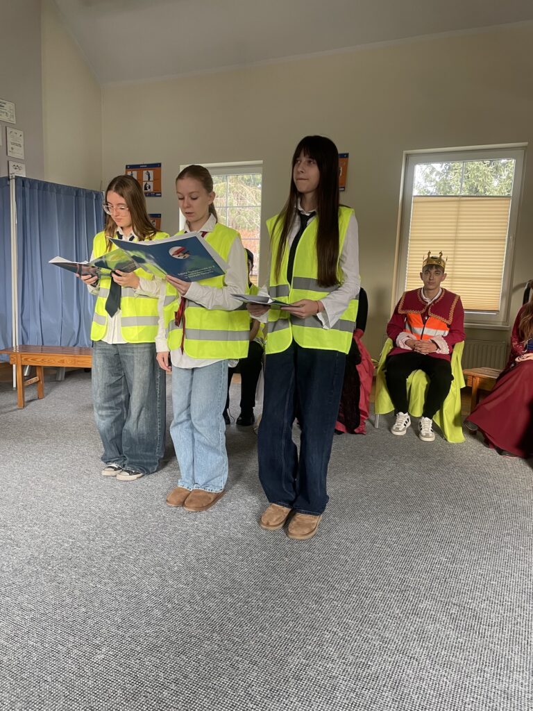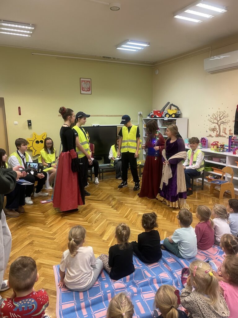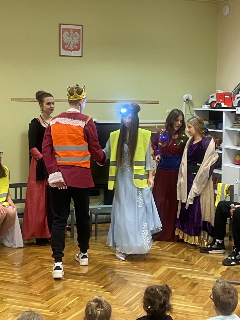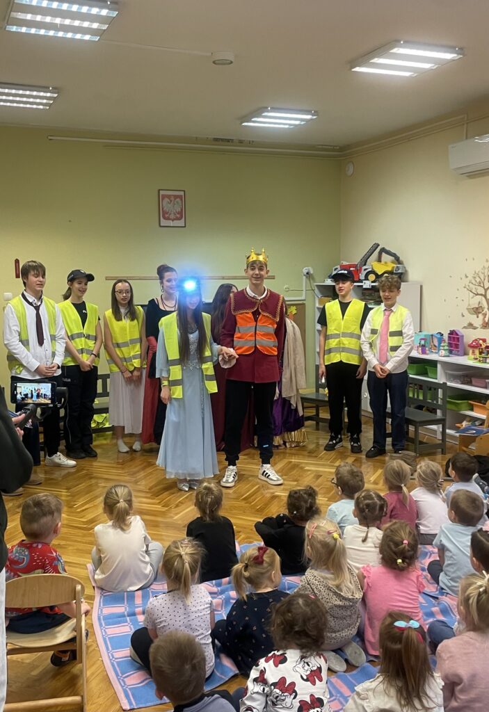 W ramach szkolnej akcji edukacyjnej przygotowaliśmy przedstawienie „Odblaskowy Kopciuszek” — bajkę dobrze znaną, ale opowiedzianą na nowo, z humorem i ważnym przesłaniem: odblaski ratują życie. Najpierw odwiedziliśmy przedszkolaków, którzy słuchali z szeroko otwartymi oczami i reagowali na każdy błyszczący element sceny. Dla wielu z nich największą atrakcją nie był nawet sam Kopciuszek, lecz… migające odblaskowe buty i czarodziejska kamizelka Wróżki Odblaskowej!