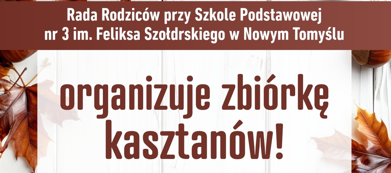 Rada Rodziców przy Szkole Podstawowej nr 3 im. Feliksa Szołdrskiego w nowym Tomyślu organizuje w dniu 10 października 2025 r. szkolną zbiórkę kasztanów. Zachęcamy wszystkich uczniów do udziału w tej akcji – trzy klasy, które zbiorą najwięcej kasztanów, otrzymają nagrody niespodzianki. Liczymy na wspólny entuzjazm i dobrą zabawę! Rada Rodziców