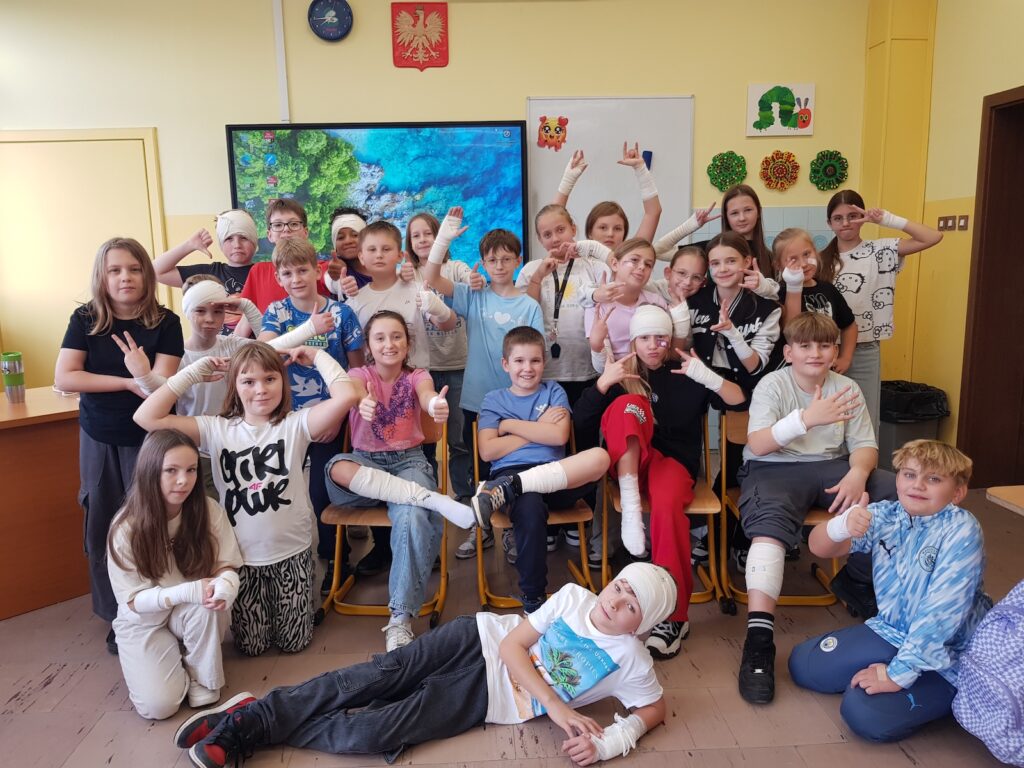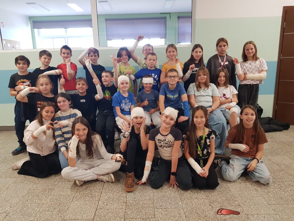 W naszej szkole teoria idzie w parze z praktyką! Uczniowie klas 4c, 4d i 4e wzięli udział w zajęciach, podczas których mogli sprawdzić w praktyce swoją wiedzę z zakresu pierwszej pomocy. Tematem przewodnim spotkania było wykonywanie opatrunków na różnych częściach ciała.