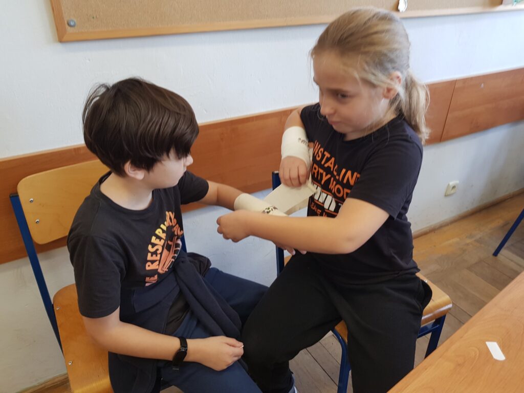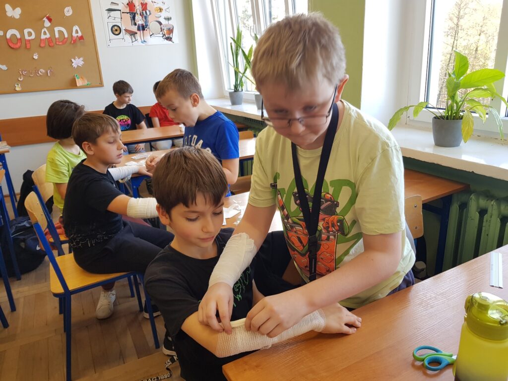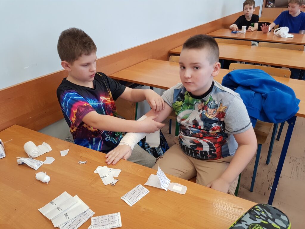 Pod czujnym okiem nauczyciela uczniowie poznali podstawowe zasady udzielania pomocy w przypadku skaleczeń, zadrapań czy drobnych ran. Następnie, pracując w parach, samodzielnie wykonywali opatrunki na dłoniach, kolanach, łokciach, a nawet na głowie!