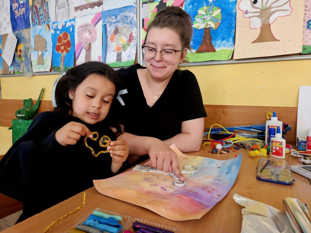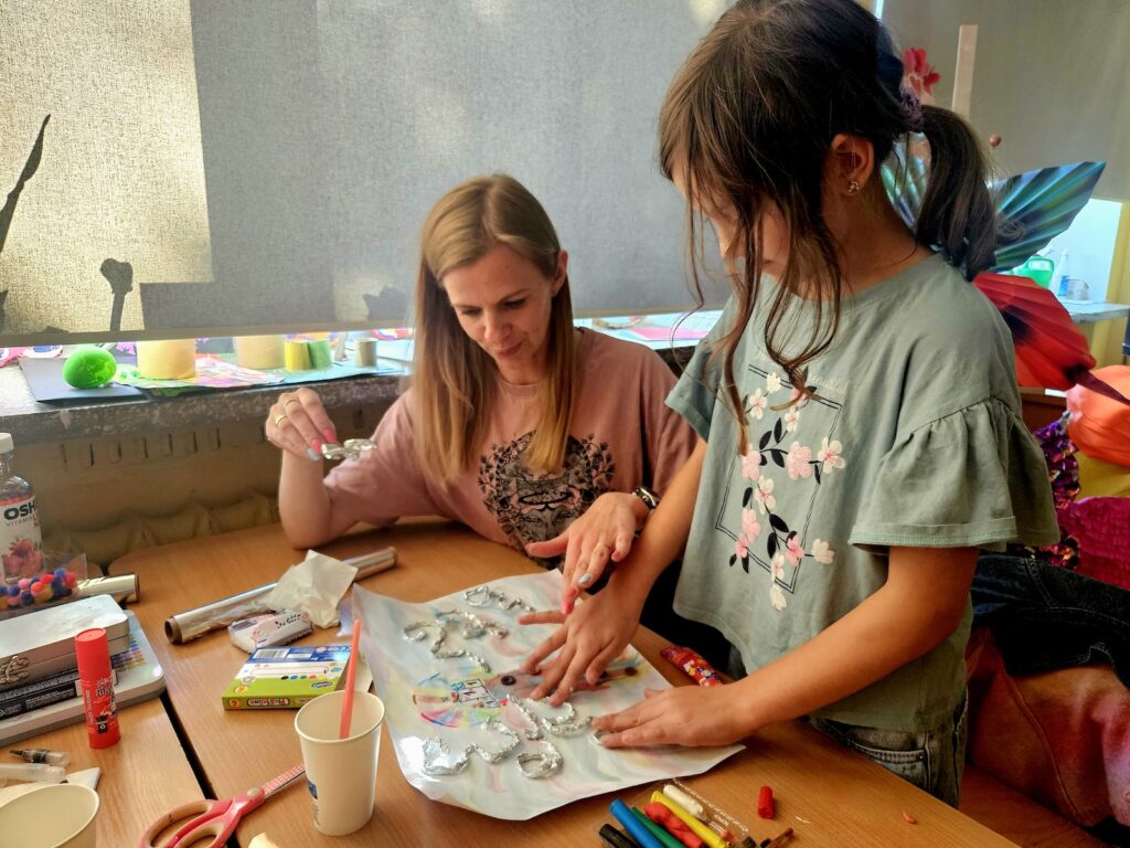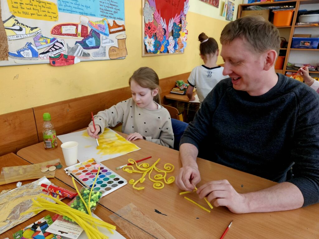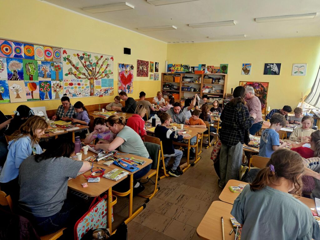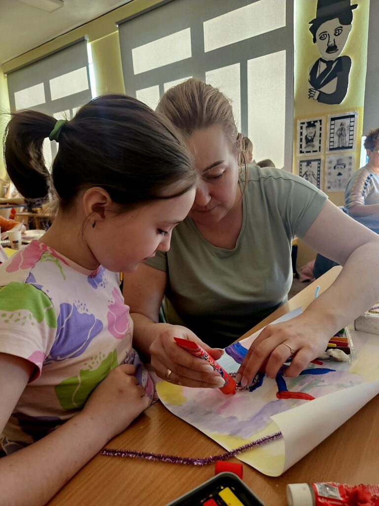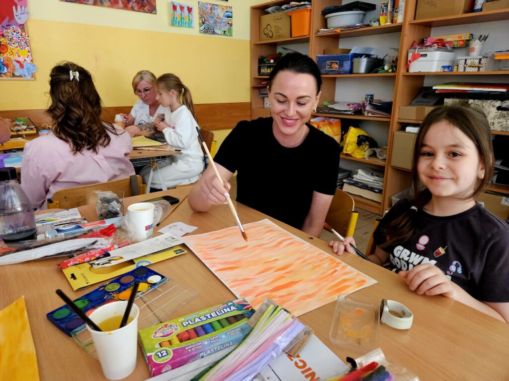 Zadanie okazało się czymś więcej niż tylko ćwiczeniem plastycznym – stało się pretekstem do rozmów, refleksji i dzielenia się historiami. Sprzyjała temu również organizacja przestrzeni – przy jednym, czteroosobowym stole pracowały zazwyczaj dwie rodziny, co w naturalny sposób budowało atmosferę otwartości, integracji i wzajemnej inspiracji.