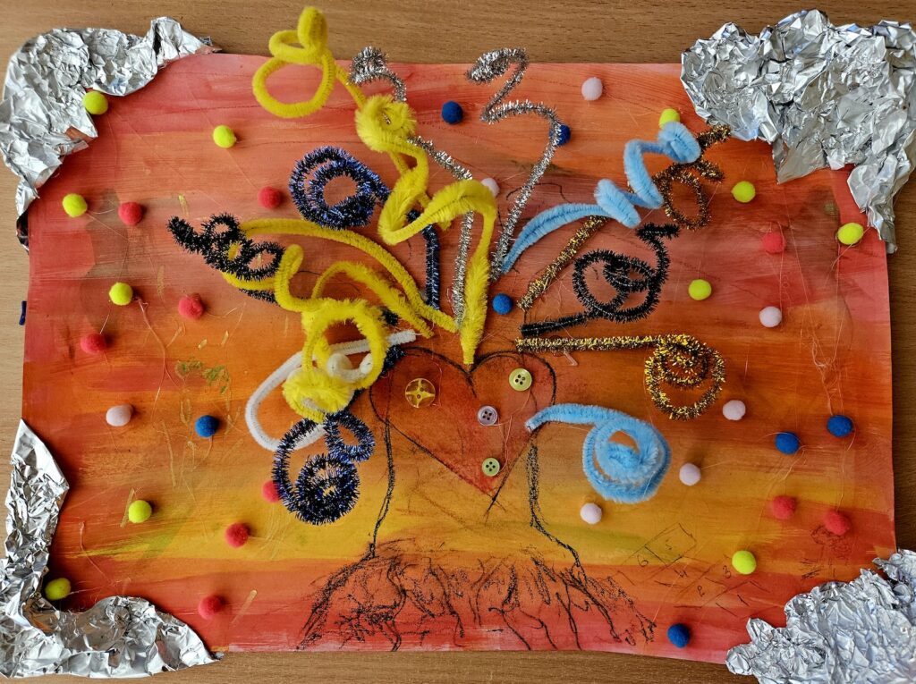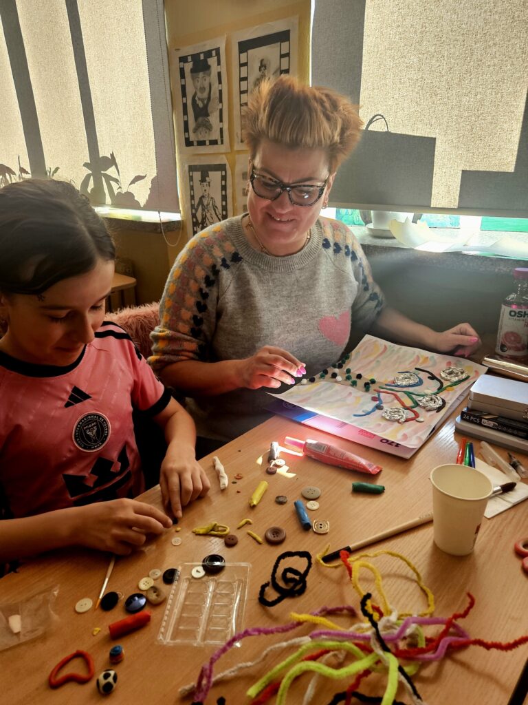 Właśnie dlatego ten motyw tak naturalnie wpisał się w ideę naszego spotkania. Każda rodzina otrzymała zadanie, by zastanowić się nad własnym symbolem – czymś, co ich definiuje, co jest dla nich ważne – i umieścić go w centralnym punkcie swojej pracy. W ten sposób powstające dzieła stawały się nie tylko kompozycjami plastycznymi, ale osobistymi opowieściami o bliskości, wartościach i wspólnych doświadczeniach.