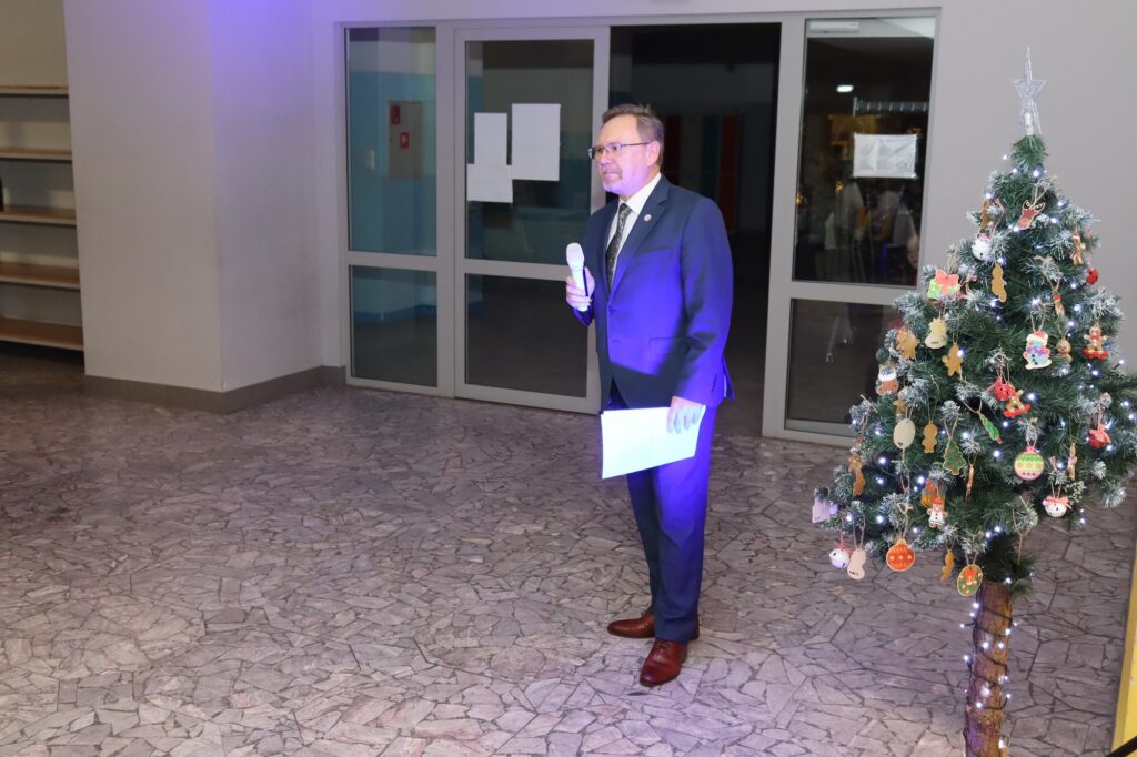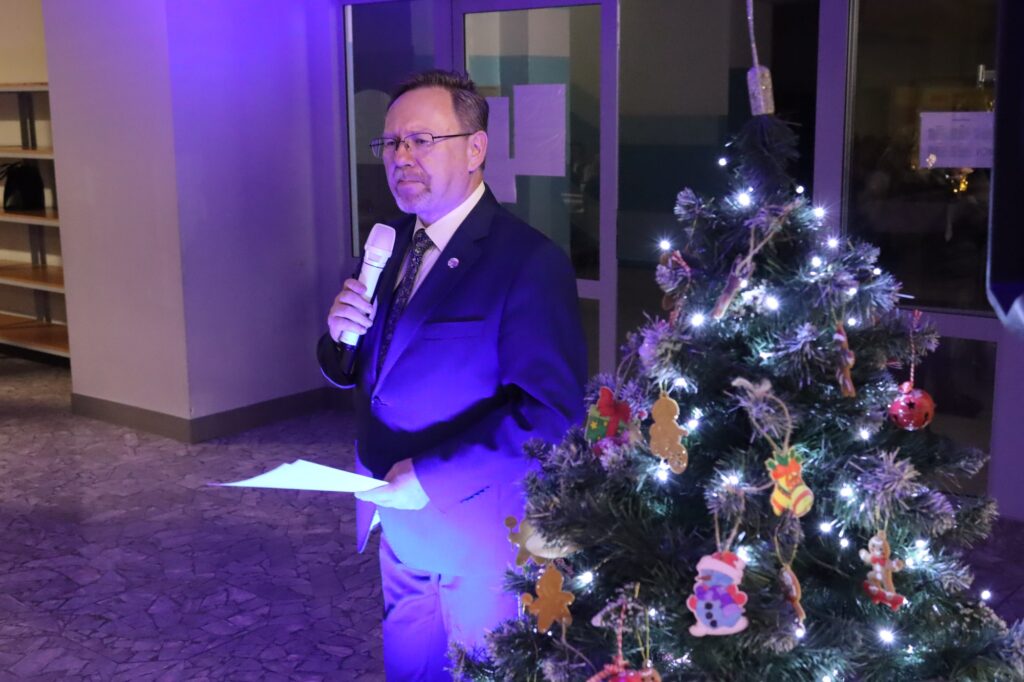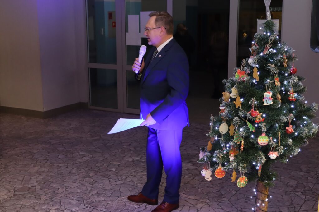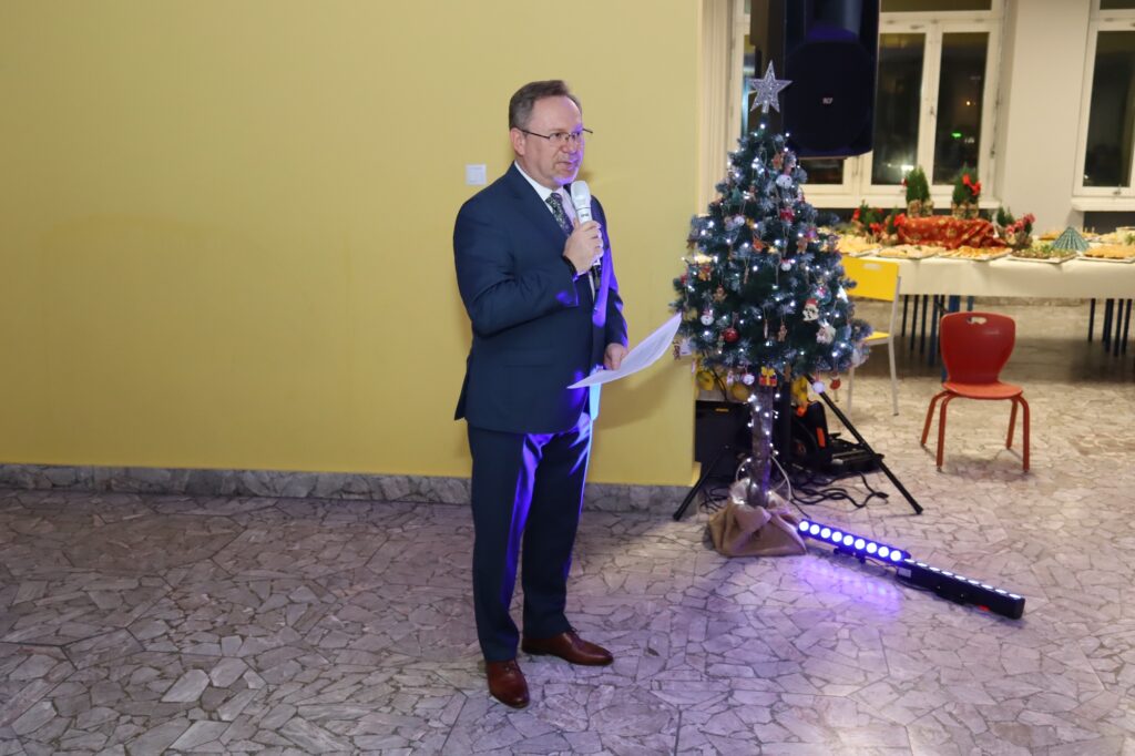 Następnie głos zabrał dyrektor szkoły Dariusz Stachecki. W swoim wystąpieniu podkreślił, że spotykamy się na początku nowego roku, w szczególnym momencie – pełnym nadziei, planów i nowych wyzwań. Jest to dobra okazja, aby na chwilę się zatrzymać, spojrzeć wstecz na miniony rok oraz z optymizmem pomyśleć o tym, co przed nami. W 2025 roku pożegnaliśmy Krzysztofa Urbaniaka i Lucynę Morawską. Te smutne okoliczności poruszyły każdego z nas…