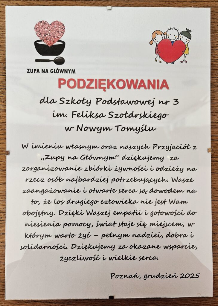 W grudniu społeczność naszej szkoły z zaangażowaniem włączyła się w coroczną, przedświąteczną zbiórkę darów na rzecz poznańskiego Stowarzyszenia Zupa Na Głównym, które pomaga osobom bezdomnym i potrzebującym ciepłego posiłku oraz wsparcia w trudnych zimowych warunkach.
