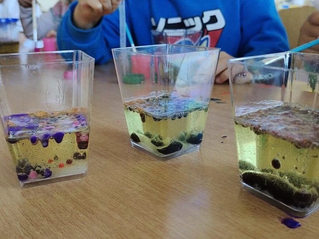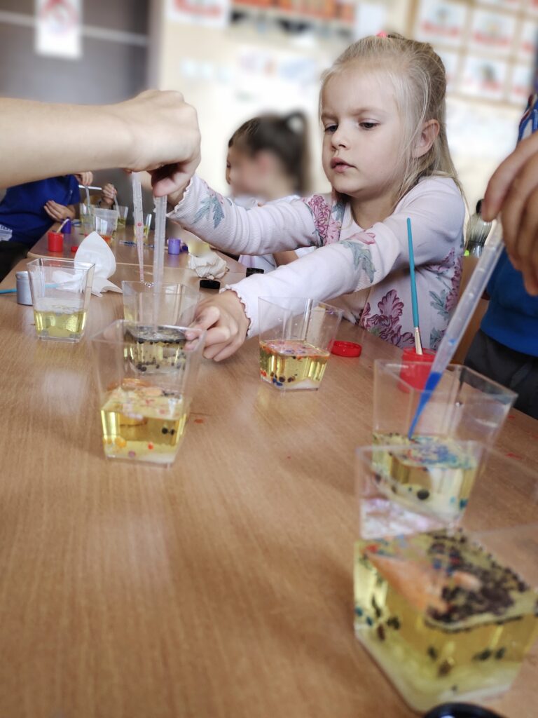 Sala zamieniła się w lotnisko – był samolot, kontrola paszportowa, straż graniczna i pierwsze pieczątki w paszportach. Po „wylądowaniu” przywitało wszystkich serdeczne „Aloha!”, zapach kwiatów lei i dźwięki ukulele. Dzieci poznały fascynujące informacje o wyspach wulkanicznych i przeprowadziły ciekawe eksperymenty, obserwując, jak rodzą się wulkany.