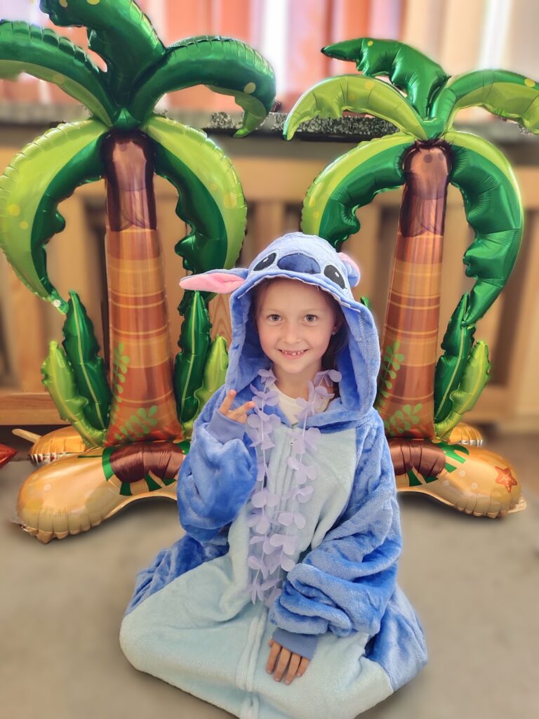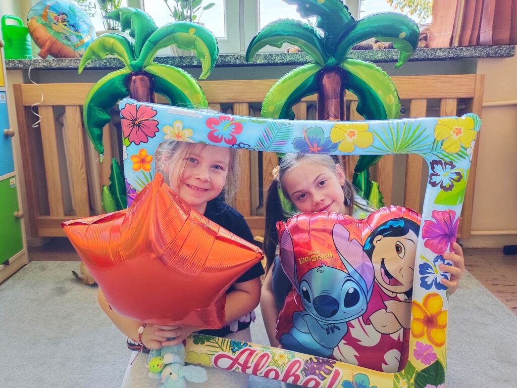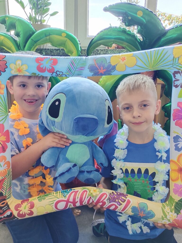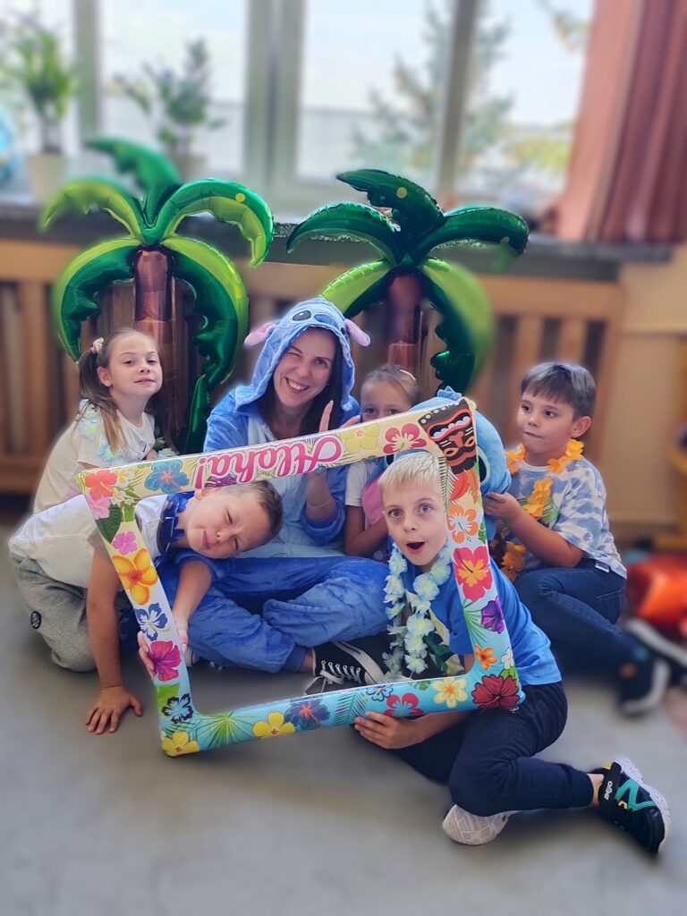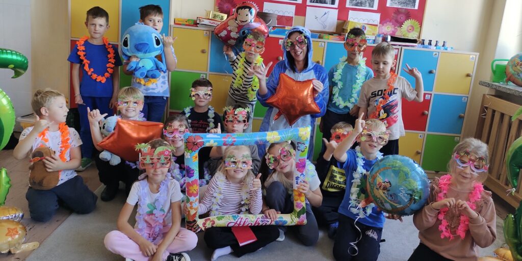 Niespodzianką dnia było spotkanie z sympatycznym Stitchem, który dołączył do zabawy. Razem tańczyli taniec hula, bawili się, jedli soczyste owoce i kolorowe galaretki. Na zakończenie podróży uczniowie zapisali swoje pierwsze wspomnienia w pamiętnikach podróżnika, z uśmiechem i ekscytacją spoglądając na kolejne strony mapy.