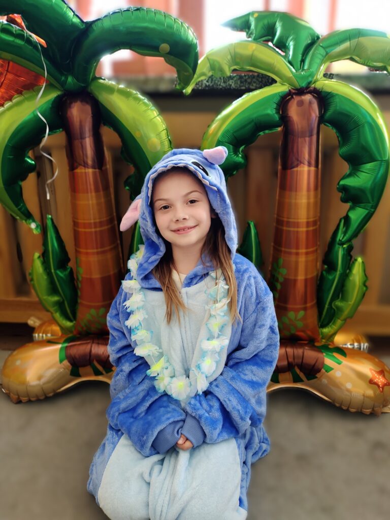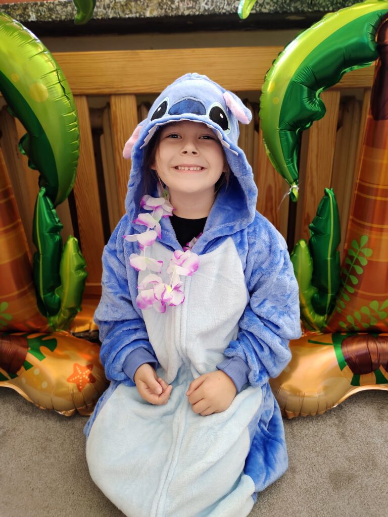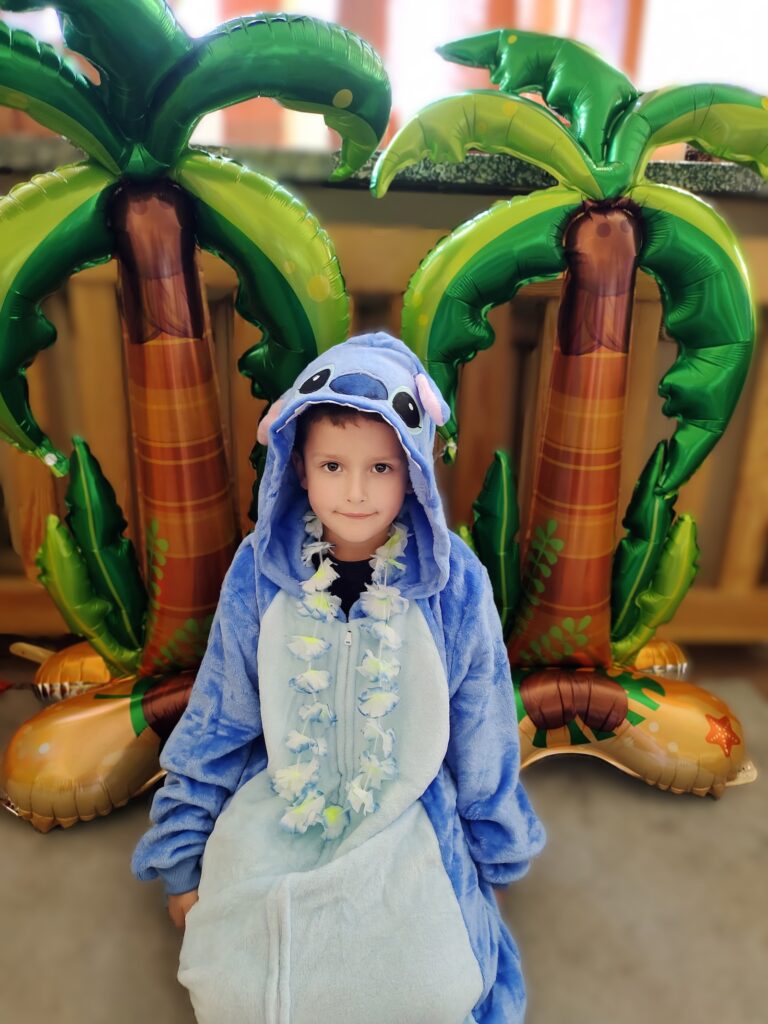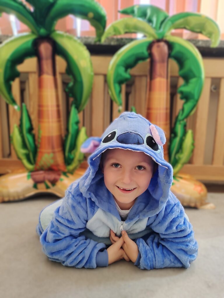 Niespodzianką dnia było spotkanie z sympatycznym Stitchem, który dołączył do zabawy. Razem tańczyli taniec hula, bawili się, jedli soczyste owoce i kolorowe galaretki. Na zakończenie podróży uczniowie zapisali swoje pierwsze wspomnienia w pamiętnikach podróżnika, z uśmiechem i ekscytacją spoglądając na kolejne strony mapy.