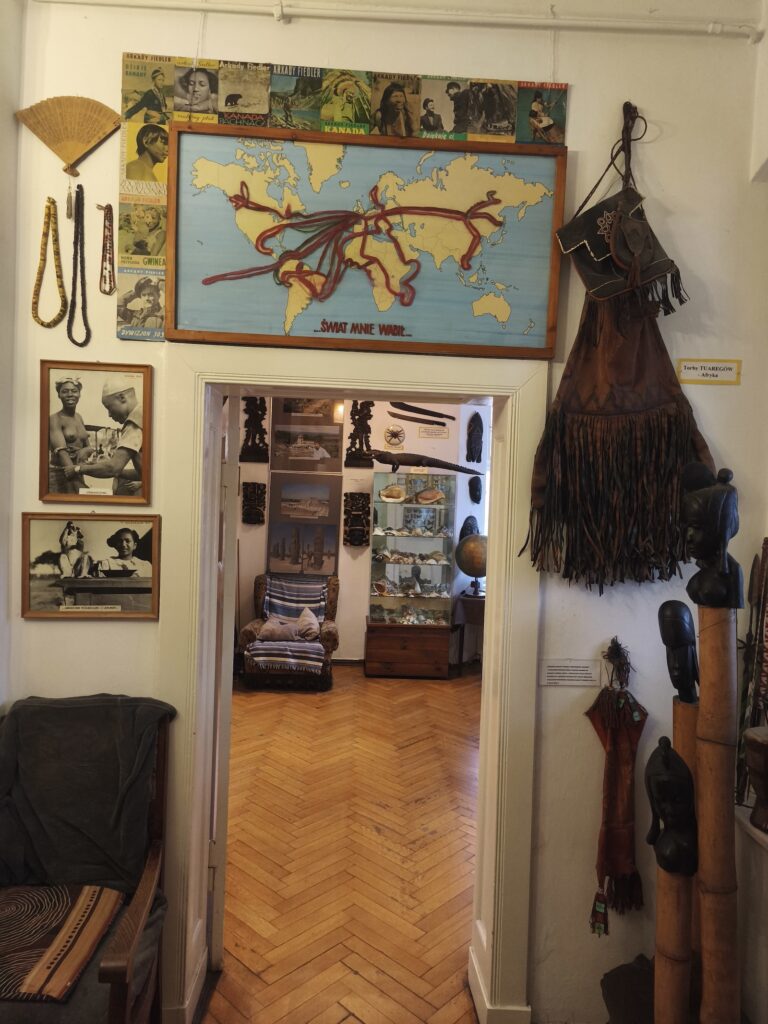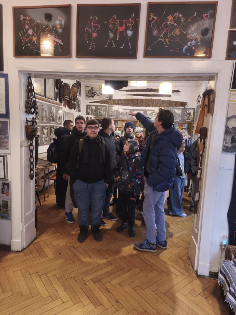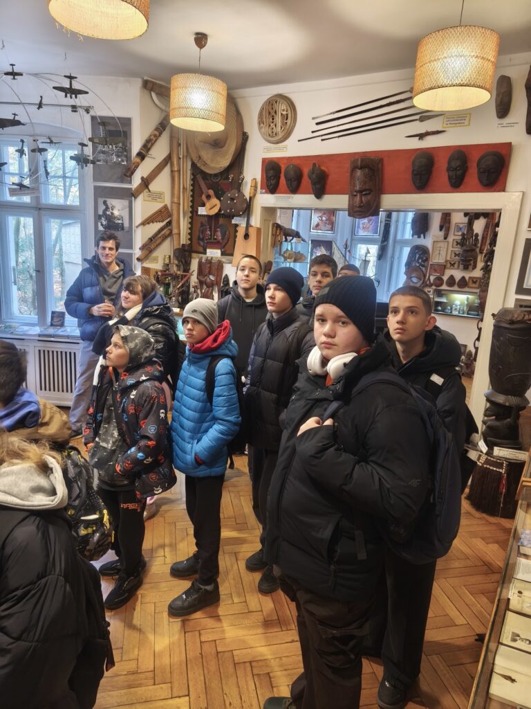 Kolejnym punktem programu była lekcja muzealna dotycząca kultur świata, przygotowana w oparciu o bogate zbiory etnograficzne Fiedlera. Uczniowie poznali zwyczaje i tradycje ludów Ameryki Południowej, Afryki oraz Azji. Z dużym zainteresowaniem oglądali maski, rzeźby, stroje ceremonialne i instrumenty muzyczne przywiezione przez pisarza z jego licznych podróży. Podczas zajęć rozmawiano o różnorodności kultur, ich wzajemnym przenikaniu się i znaczeniu zachowania tradycji. Lekcja była interaktywna – uczniowie mogli zadawać pytania, dotykać niektórych eksponatów, a także spróbować odgadnąć funkcję wybranych przedmiotów.