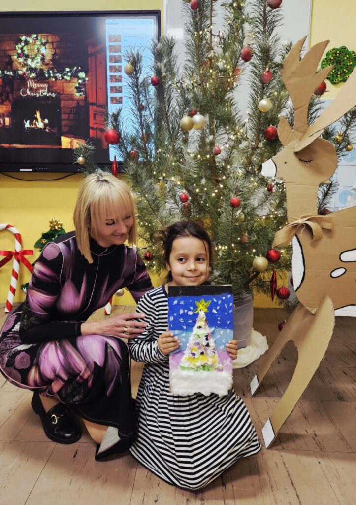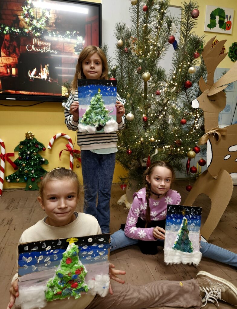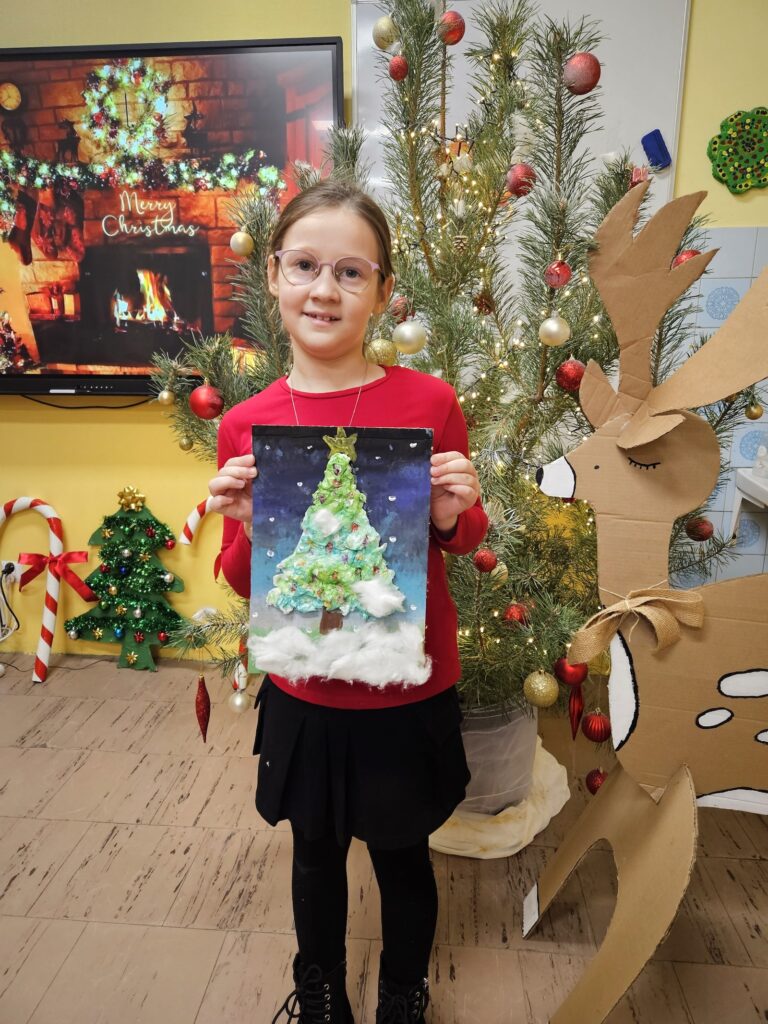 12 grudnia w pracowni plastycznej odbyły się zimowe warsztaty plastyczne dla dzieci z klas edukacji wczesnoszkolnej. Już od progu małych artystów witała wyjątkowa, świąteczna atmosfera. Sala była starannie przygotowana i udekorowana zimowo-świątecznymi ozdobami, dzięki czemu od samego początku można było poczuć magię nadchodzących świąt. Całość dopełniała delikatna, świąteczna muzyka, która towarzyszyła nam przez cały czas trwania warsztatów.