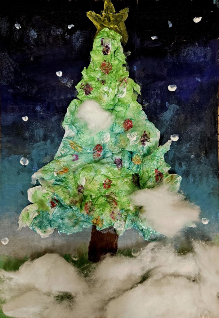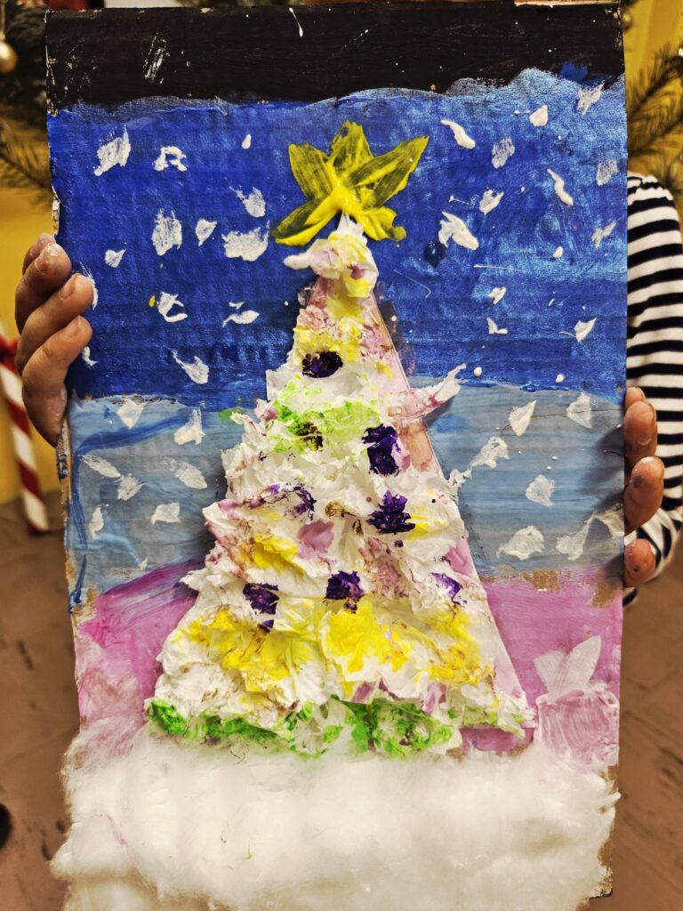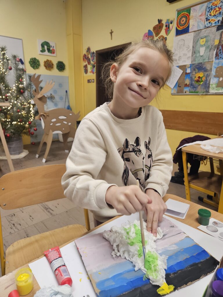 Po zajęciu miejsc przy przygotowanych stanowiskach pracy rozpoczęliśmy twórczą zabawę. Tematem zajęć było wykonanie zimowego obrazka przedstawiającego wielobarwną choinkę. Dzieci tworzyły drzewko z papierowych kulek, które następnie malowały farbami akrylowymi. Każda choinka była inna – pełna kolorów, pomysłowości i dziecięcej radości tworzenia.